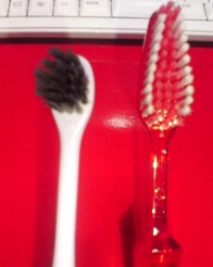 左は私が使用している歯ブラシです。まあ、私が小さめの歯ブラシを使っているのもあるのでしょうが、大きいです、この写真じゃいまいち大きさが伝わらないかもですが・・・。あと毛も長いです。